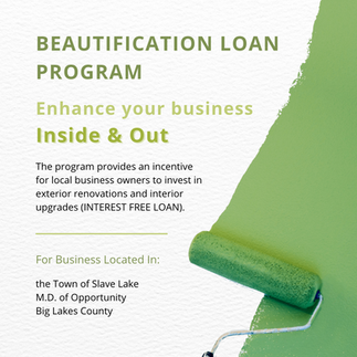 Eligibility: Businesses within the following municipalities can apply for a three-year interest-free beautification loan: the Town of Slave Lake, the Municipal District of Opportunity, and Big Lakes County.